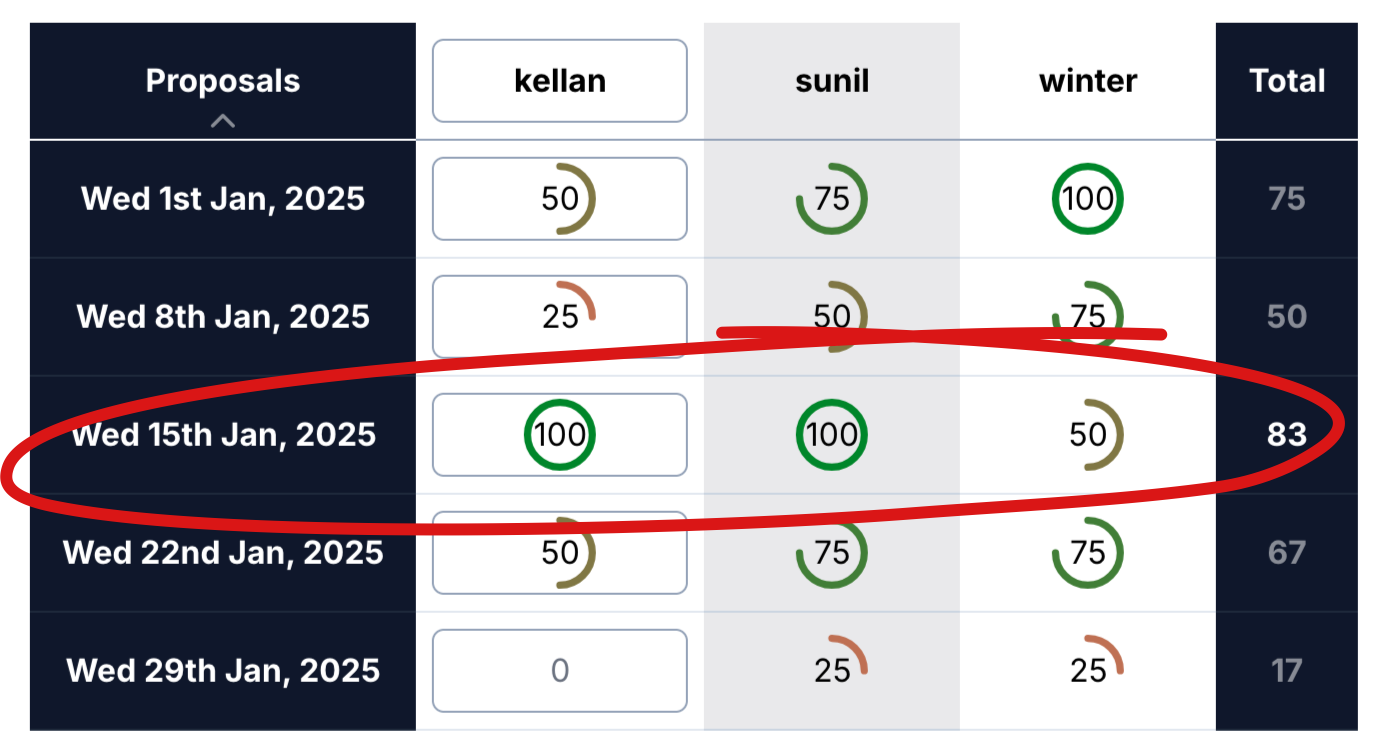 JustMeet.io allows attendees to specify how convenient each proposition is on a scale of 0-100. This represents the percentage likelihood they would attend.